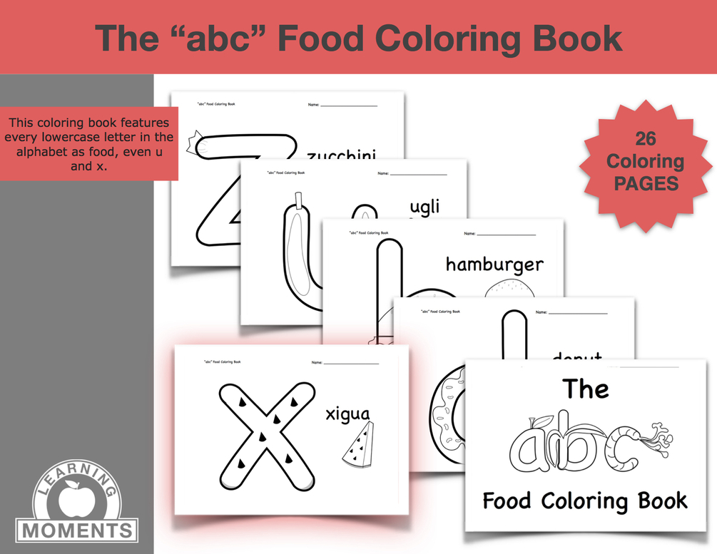 Have fun teaching your preschoolers or kindergarten kiddos their lowercase letters with The "abc" Food Coloring Book. This coloring book features every letter in the alphabet as food, even u and x.